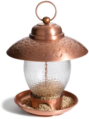 - Rust-resistant iron and hammered glass bird feeder with a brushed copper finish